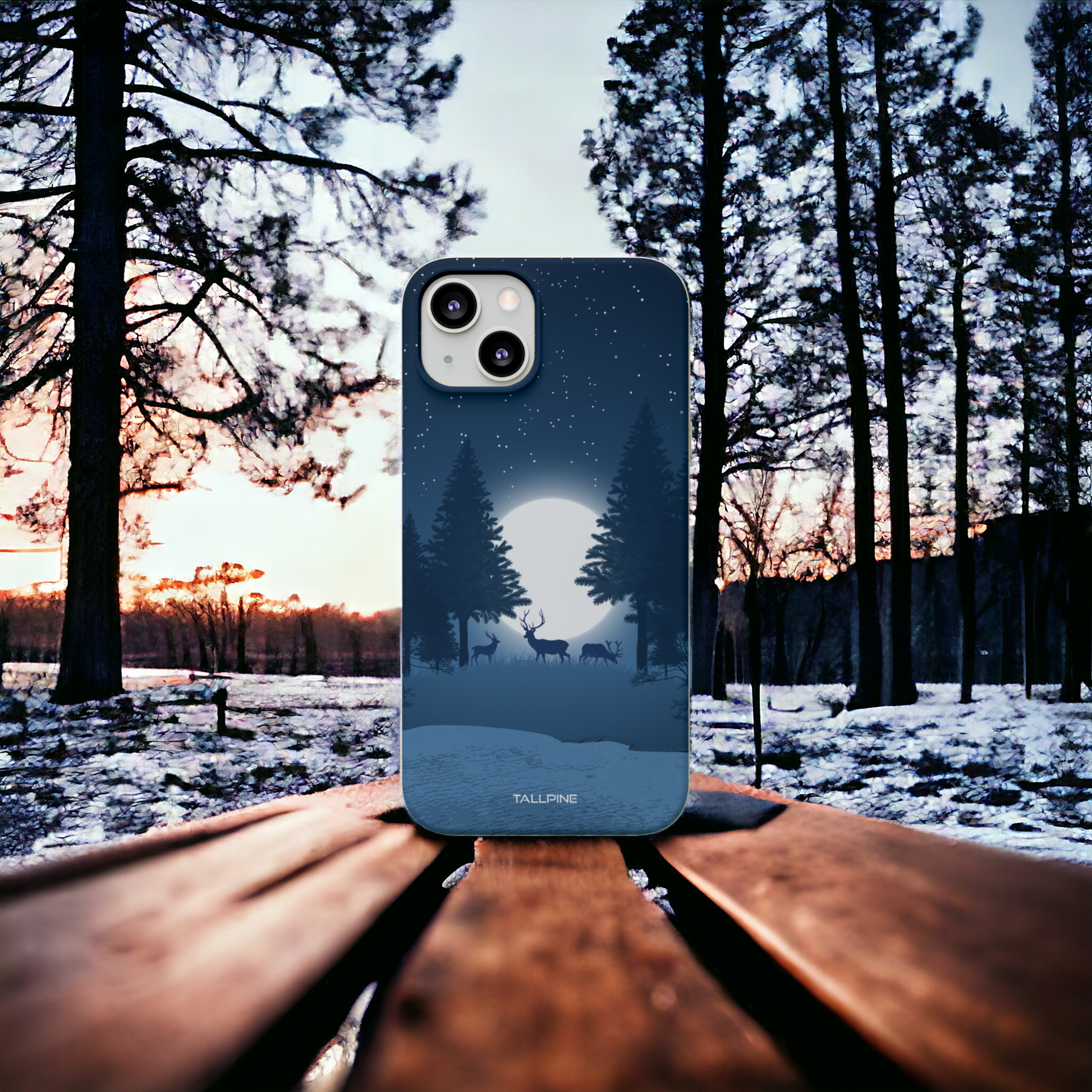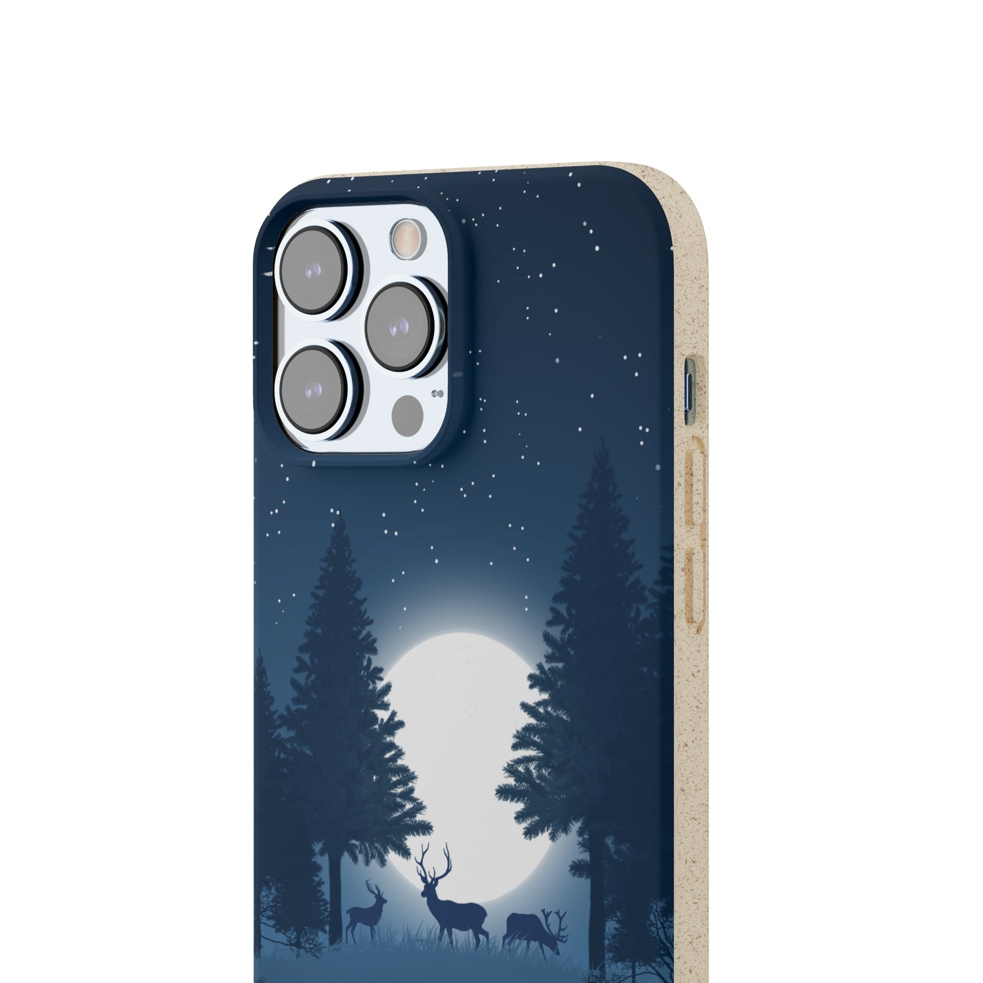 Vårt komposterbara telefonskal Nordic Woodland Whispers har en mörkblå bakgrund prydd med vackert illustrerade rådjur, renar, en fullmåne och en frusen sjö. Det är en fantastisk design som fångar den fridfulla skönheten i en vinternatt i den nordiska vildmarken.